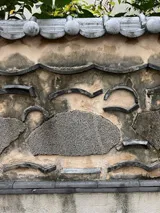 博多塀は近くにある櫛田神社などにもあり、戦火で焼け残った石や瓦などを練土の中に塗り込んだ土塀です。その起源は豊臣秀吉が推奨したと言われ、博多町割を語り継ぐ歴史的な遺跡です。