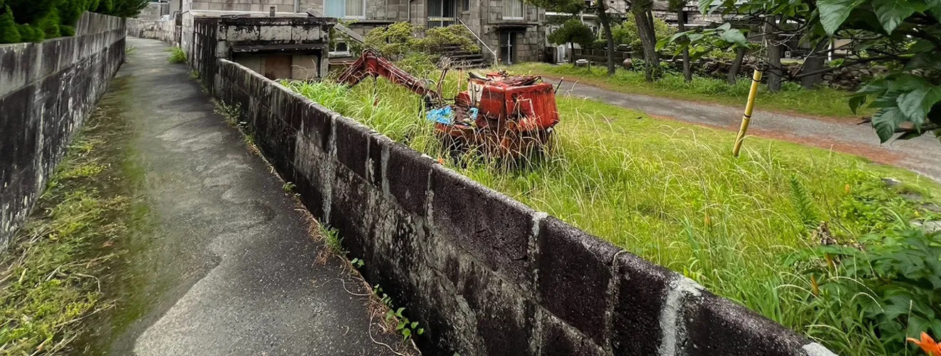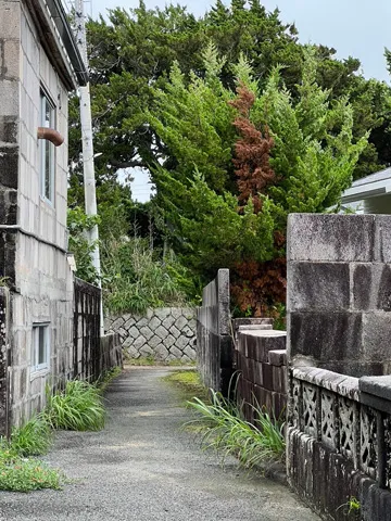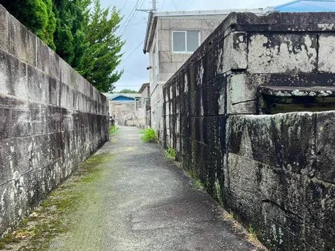二重菱形を彫り込んだ石塀や、2寸・3寸厚の石を積んだだけの塀のほか、納屋と思われる建物が道境に建てられ、石塀代わりとなっている。